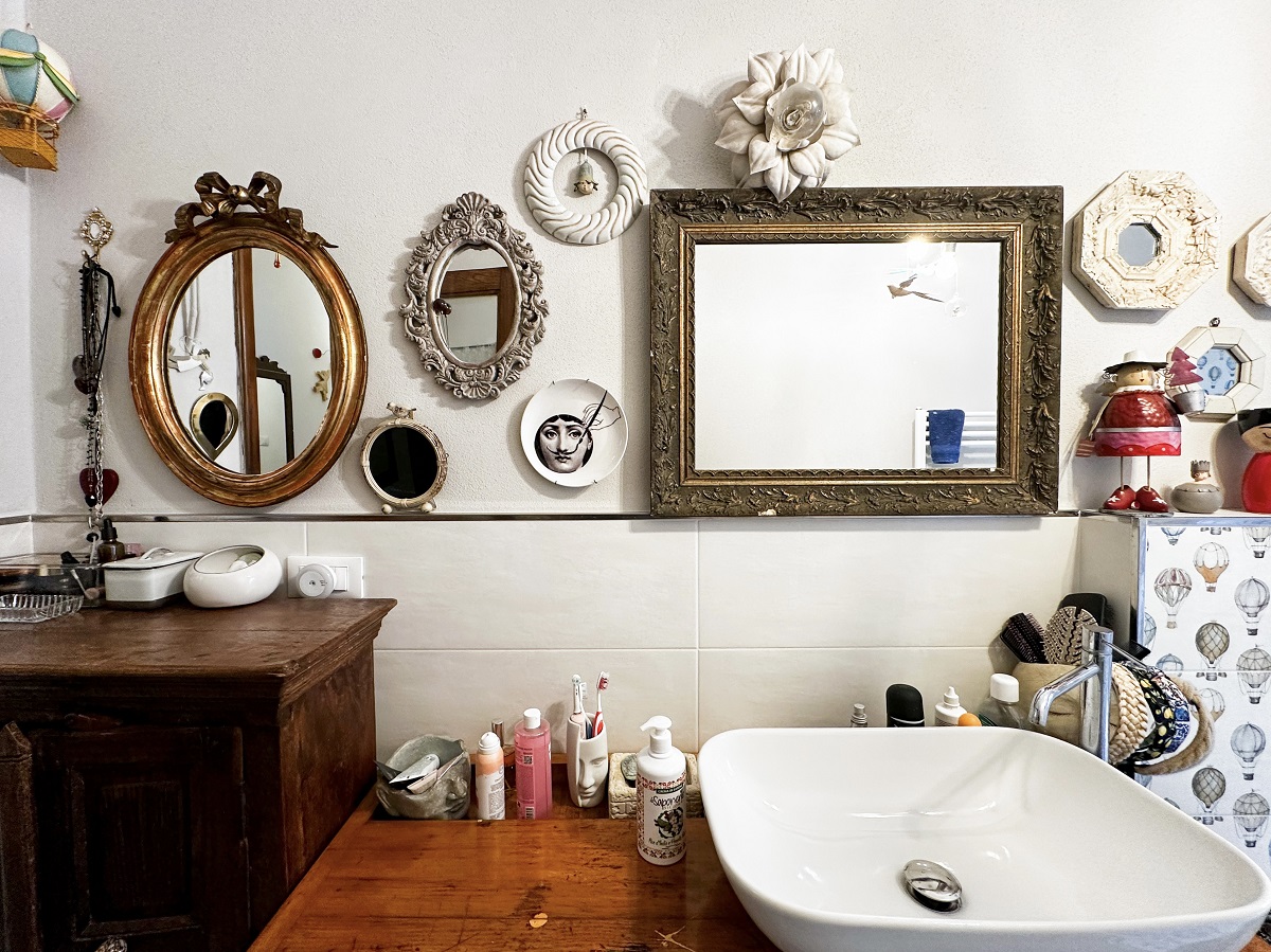 Piano Primo (zona notte) : salone di ingresso su cui affacciano le 4 grandi camere ognuna dotata di bagno privato. La casa dispone di ingressi indipendenti ad ogni piano ed è circondata dal terreno/giardino sistemato ad ampie e vivibili fasce tipicamente ligure piantumato ad ulivo.